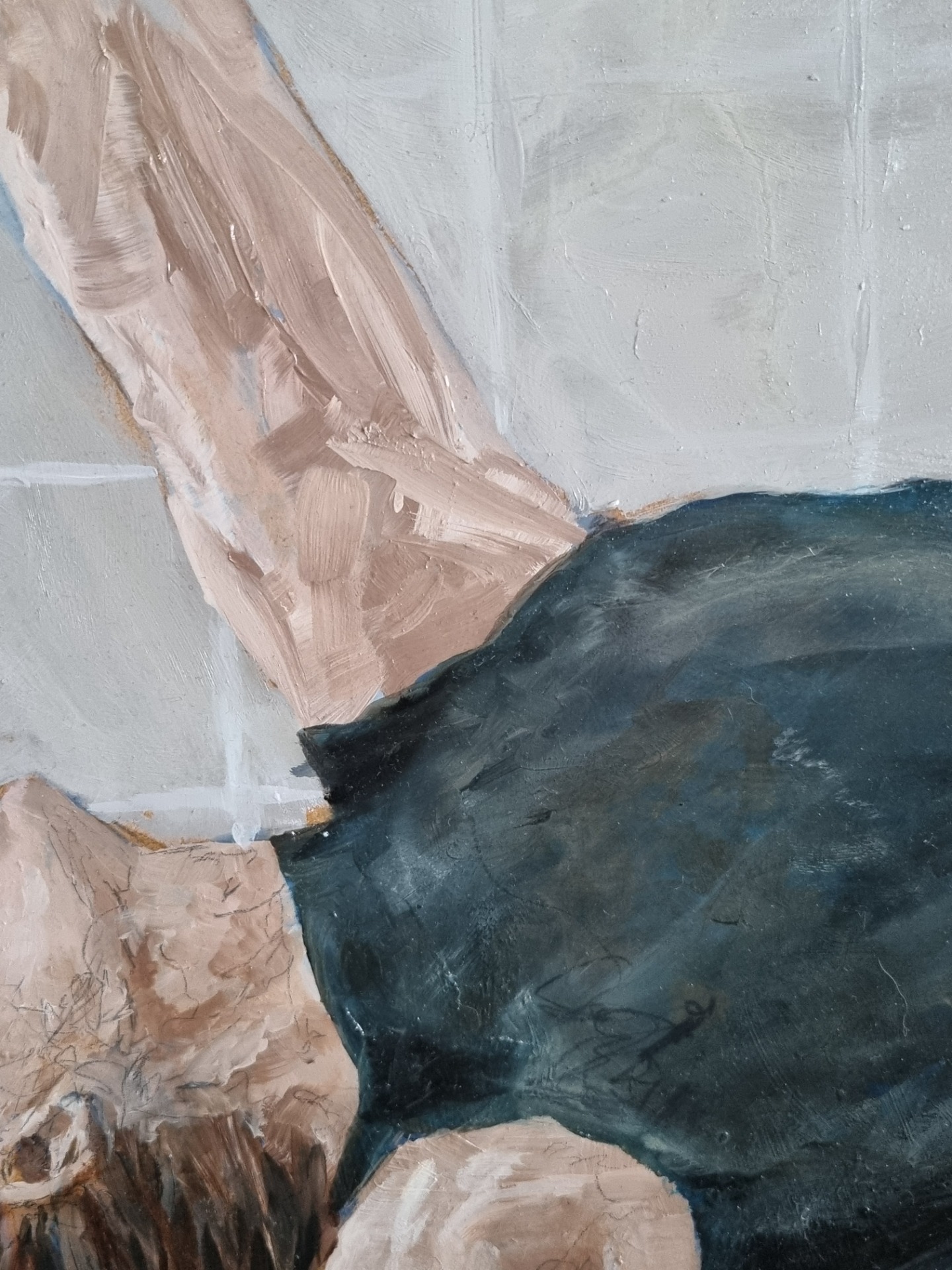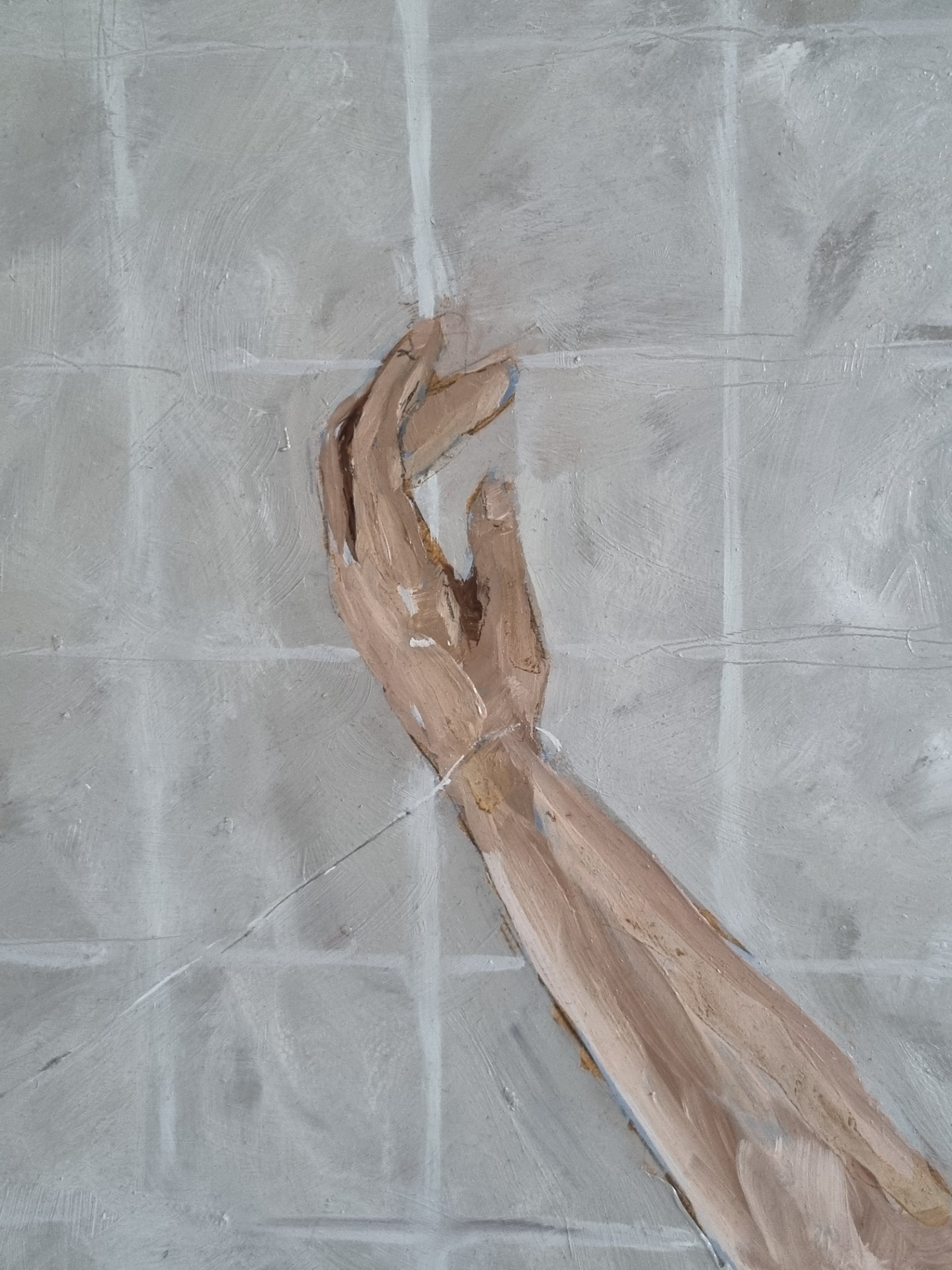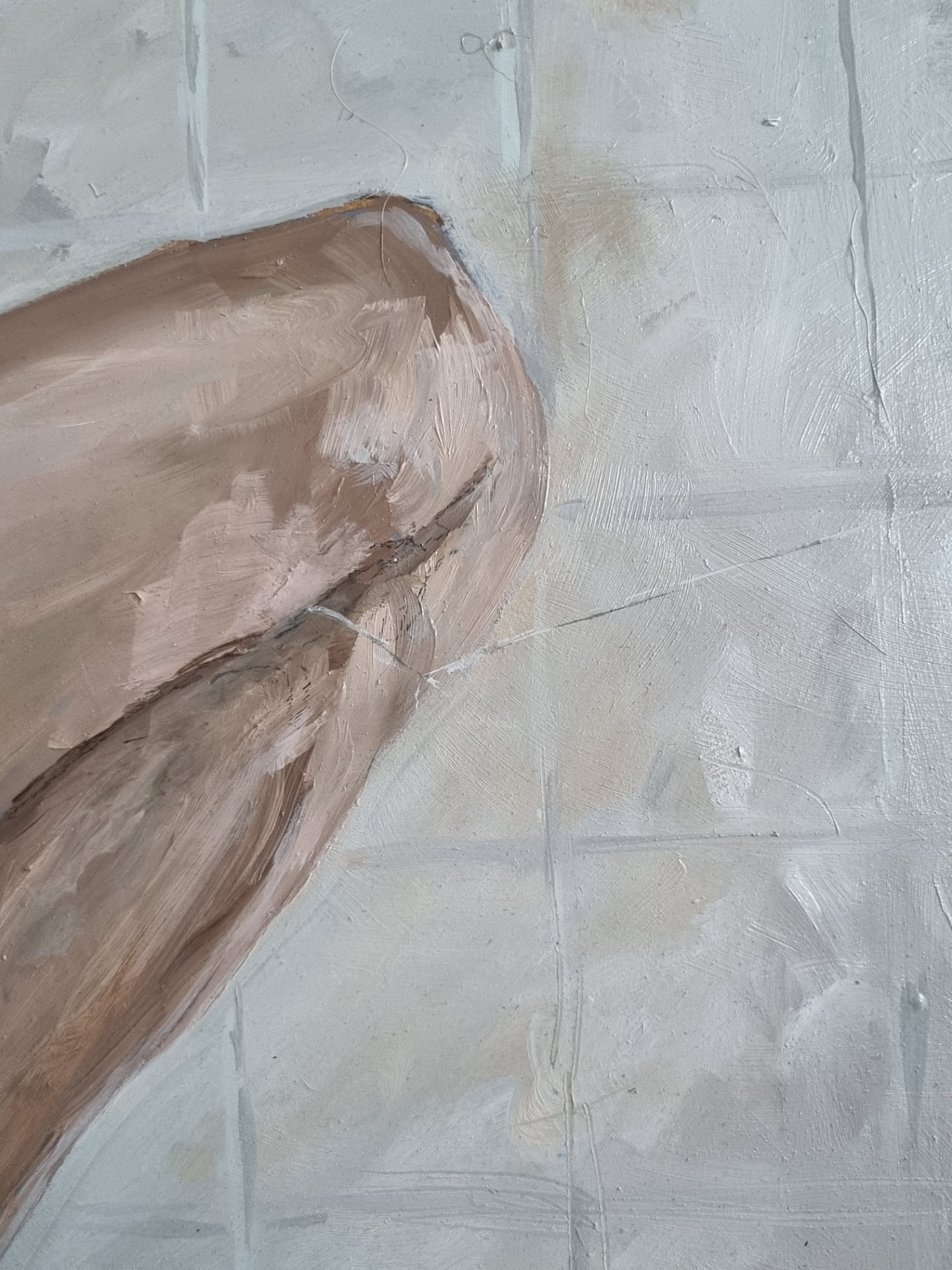 Maalattu kovalevylle, jolla mäntyrimasta tukirakenne. Reunat maalattu harmaaksi.